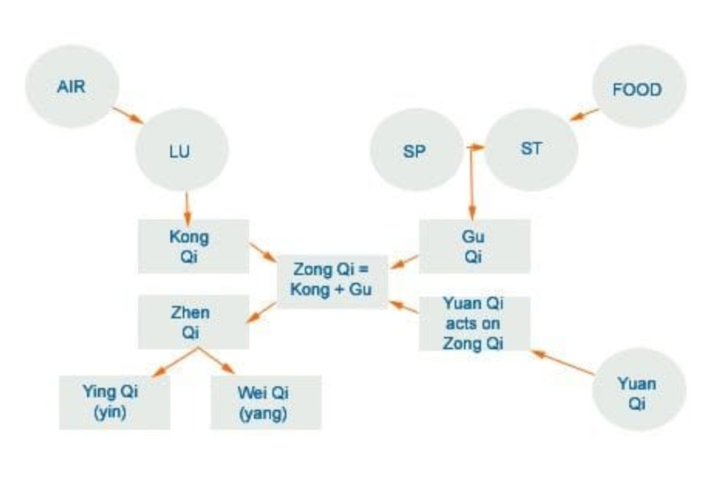 Üçüncü olarak kanla hareket eden, havadan kaynaklanan, besinlerden elde edilen ve atalardan aktarılan orijinal Qi ‘yi aşamalarını kan düzeylerinde kanı dönüştürmek, oluşturmak ve vücudu beslemekten sorumlu Qi türlerinden bahsedebiliriz.